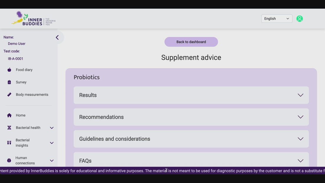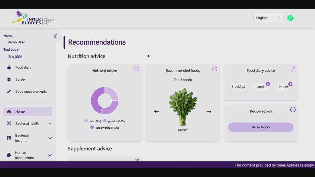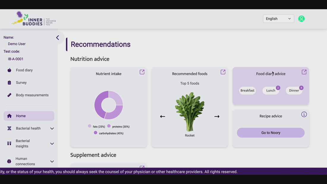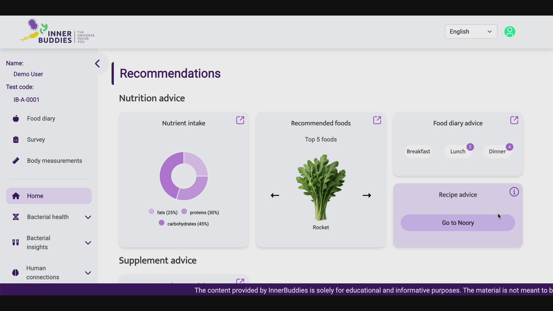 Nos experts vous fournissent des recommandations nutritionnelles basées sur votre analyse et questionnaire. Elles vous indiquent les aliments à augmenter et à réduire (avec leur portion correspondante) pour optimizer le bon fonctionnement de vos bactéries. Vous verrez également :