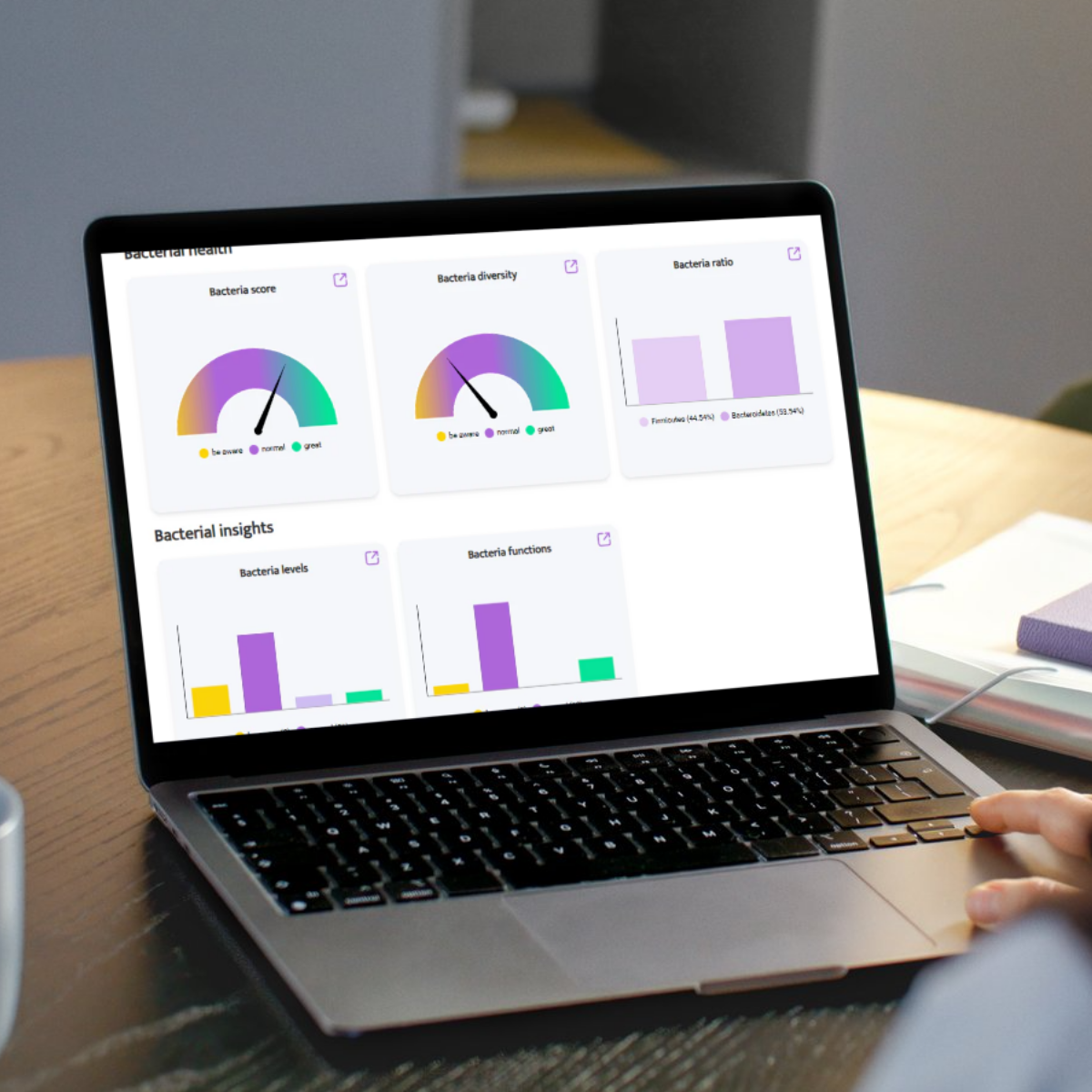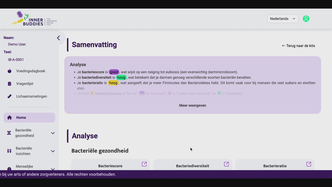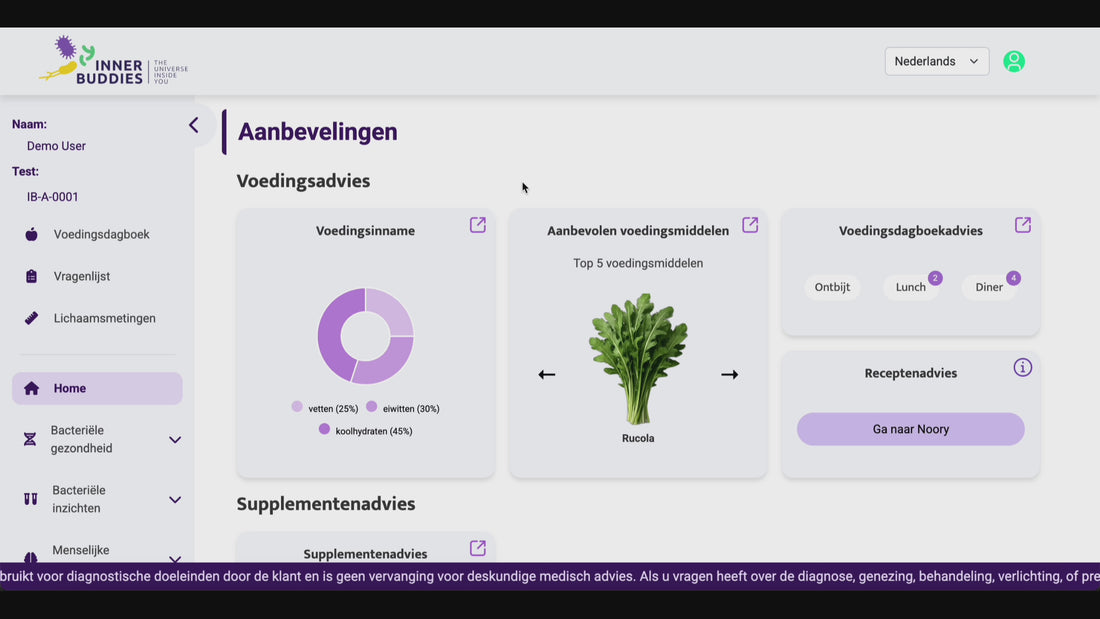 Onze experts geven je voedingsaanbevelingen op basis van je analyse en vragenlijst. Ze vertellen je welke voeding te vermeerderen of verminderen (met hun bijbehorende portiegrootte) om je bacteriefuncties te bevorderen. Je ziet ook een: