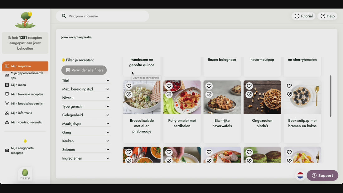 Onze partner Noory geeft je dagelijkse menu's op basis van ons voedingsadvies. Het platform genereert maaltijdplannen op basis van je voeding om te vermeerderen of verminderen zodat je je gemakkelijk aan de aanbevelingen kunt houden. Je ziet ook (een):