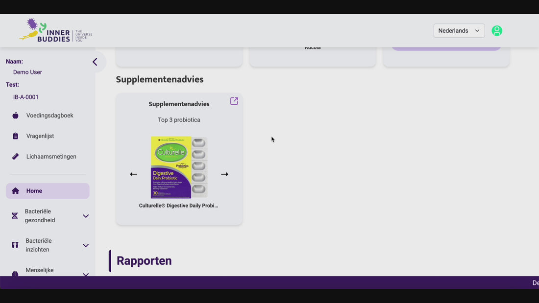Onze experts geven je pre- en probiotische suggesties op basis van je analyse en vragenlijst. Ze vertellen je welke probiotische stammen en prebiotisch(e) voedsel of verbindingen (met hun bijbehorende gezondheidsdoel) te nemen om je specifieke behoeften aan te pakken. Je ziet ook (een):